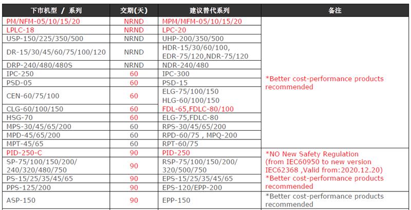 明纬将于每年1月和7月于官网更新下市机型和停产机型清单,本期清单如附一页和附二页, 一、附一页之“交期(天)”说明如下: